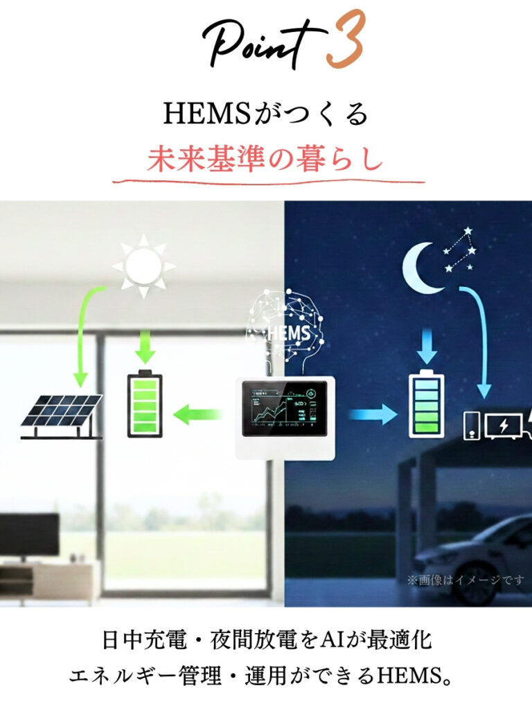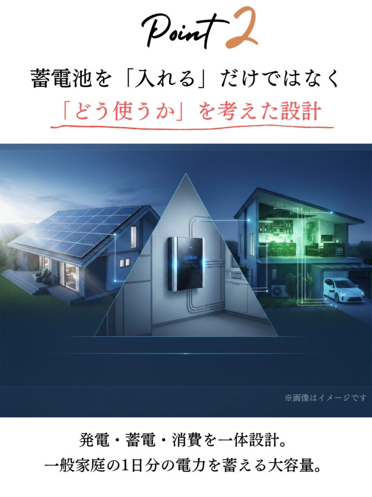 - 専用アプリと連携し、日中の余剰電力を夜間に効率的に放電