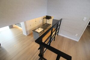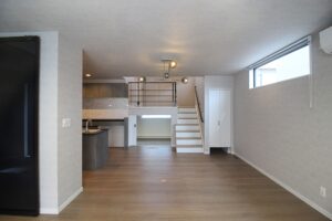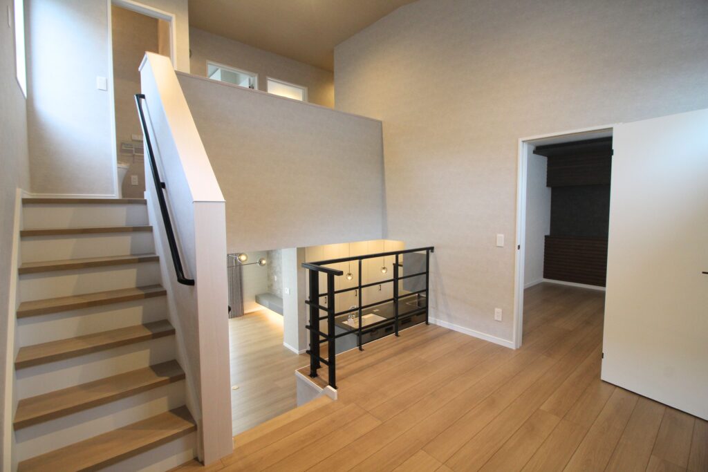 LDKから半階上がった先にあるのが寝室。階段を上がった先の空間はフリースペースとしても使えます。